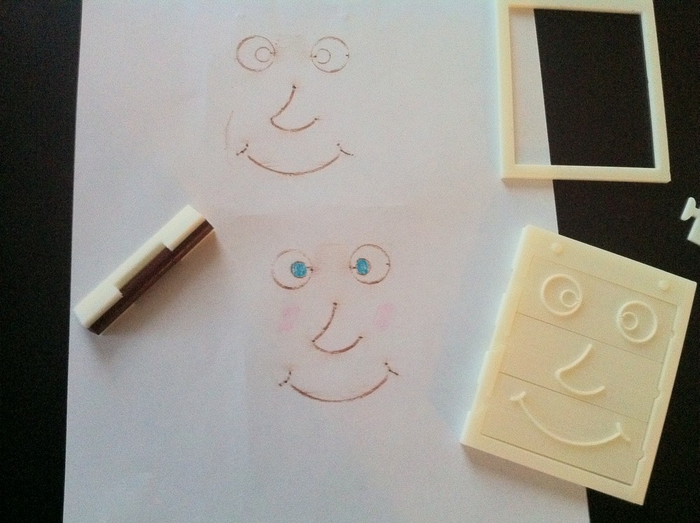 The plates themselves were taking around 15 minutes each to print. I printed an eyes/nose/mouth set and tried it out. The results were okay, but not as good as I had hoped for. (Later, I showed my wife and she remembered that she had Fashion Plates too, and that the quality I got from my first set of plates was about the same as she recalled from Fashion Plates; that is, not very good). I changed the height of the image relief from 1mm to 1.6mm and re-printed another eyes/nose/mouth set. These worked much better.