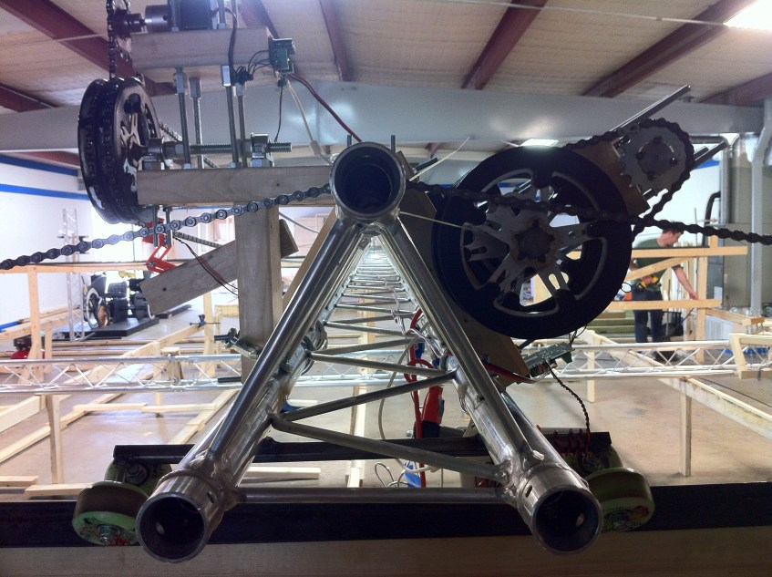 Motors and sprockets Published March 15, 2012 at 2592 × 1936 in From Novelty to Necessity Early-on build of the motors that control the X & Y movement. Note the re-purposing of the reed switch holder on the left, catching the magnets on the X-axis chain.