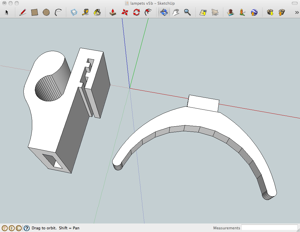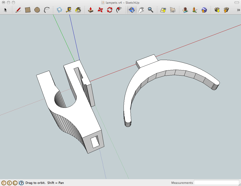 I measured the lip of the lamp shade and went to SketchUp. In 10-15 minutes I had my first version. It was simple, curvy, and pretty much what I had imagined, just in two parts. So I 3D printed one and, well, this is why I love this stuff: I have a lot to learn about industrial design, and this makes me learn it the hard way. See, the piece printed beautifully, but just did not fit onto the shade. My measurements were right, I just didn’t allow for being able to put the piece onto the shade! Big fail there.