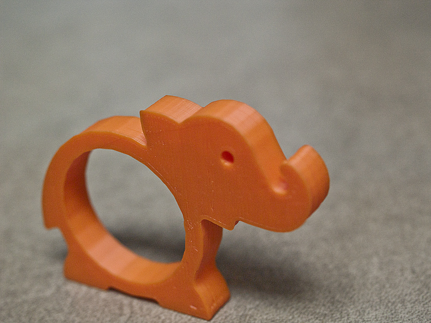 elephant in SketchUpBy this point in time, my Thing-o-Matic was halfway through it’s process and I noticed that the edges around the feet (well, foot) of the bird had started to lift off the build platform. But I also realized that where it had gotten to was really as thick as it needed to be. A quick measurement showed around 9mm, so I rounded up to 10mm for the thickness of the next 3D print. I re-sliced, re-leveled the platform, and re-sent the file to the machine. This time — perfect. While the second bird was being produced, I finished the elephant’s head and was ready then to send it on as soon as the bird was done.