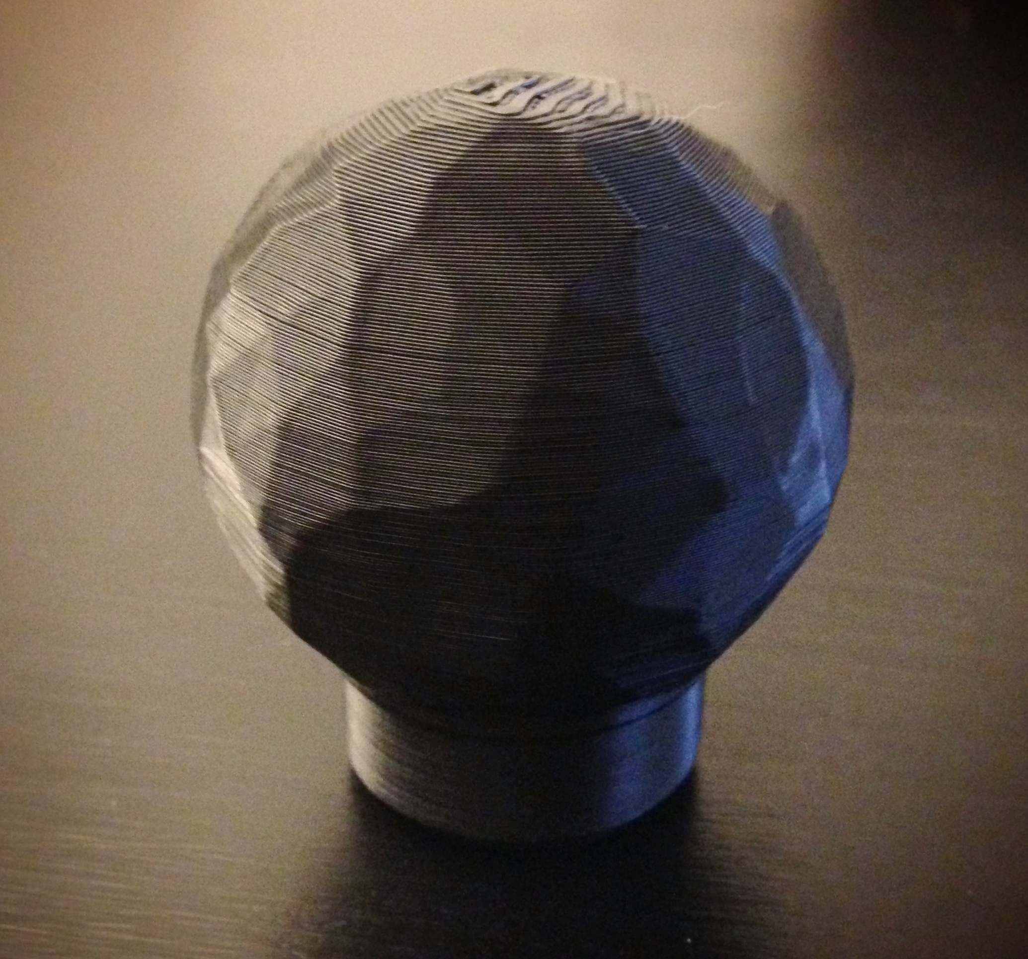The only thing I needed to do was repeat this process many times at random places around the sphere. OpenSCAD doesn’t do random numbers like other languages, so figuring this part out was the trickiest part of the whole script. Basically, you create an array of random numbers – one for each rotational axis, with as many elements as iterations of sanding. Add a rotation command before the translate in the test above, iterating over how ever many “scuffs” you want, and you’re good to go! Once done, the result was pretty awesome: