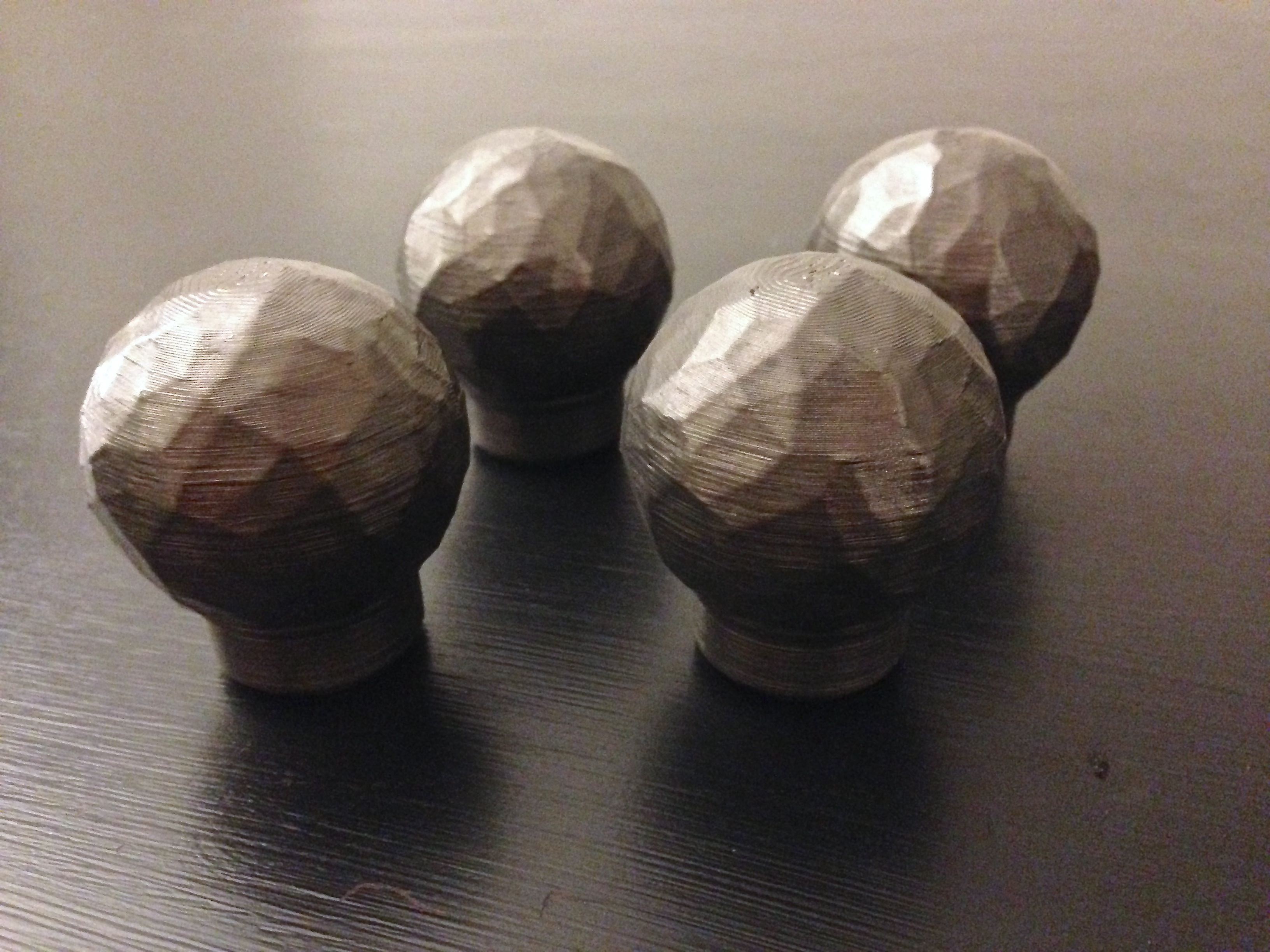 Second, the ornamental, were some finials—you know those things at the end of the curtain rods—for the dining room curtains. The ones there were not ugly, just not our style. My wife looked around online and found some that she liked, but they were rather pricey. She said they were on Restoration Hardware’s site, so I went snooping. I found a few that were nice, but I saw some “hand forged” ones that were in the $50 range for two, and looked like something I could recreate and 3D print. So for fun I modeled one, 3D printed it, and showed it to my wife who replied “great – we need three more”. So I got busy.