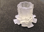 I loaded the new STL into PreForm — the software that my Form 1 3D printer uses — and it complained the model had integrity issues. It asked if I wanted to repair it so said yes, and apparently it worked okay as it didn’t say it still had problems. I selected the clear resin at the 0.1mm layer height setting and got it printing. It took a little over 3-1/2 hours, but it came out looking beautiful! It also came out about 4-5mm too small to hold a normal candlestick! I took it back into Blender and scaled it up to the correct size for US-sized candlesticks, though I haven’t printed a new one to make sure it’s correct.