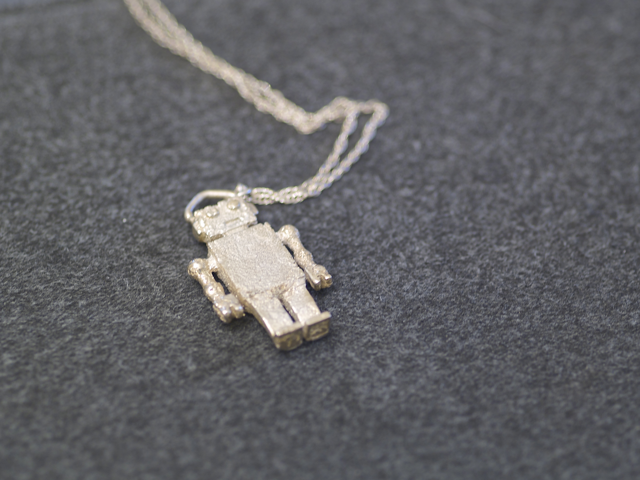 Many months ago, I also worked with real jewelry designer Bob Krug of Imagine Jewelry Studio to see if the Formlabs clear resin was able to be cast into metal. This is a process that I know nothing about, but Bob does it all the time, so I trusted his skills. He had sent me a couple of STL files–one of a ring, one of a small mushroom pendant–to output on the Form 1 and send back to him. He also offered to try one of my tiny robots, if he could get the casting process working with the prints.
