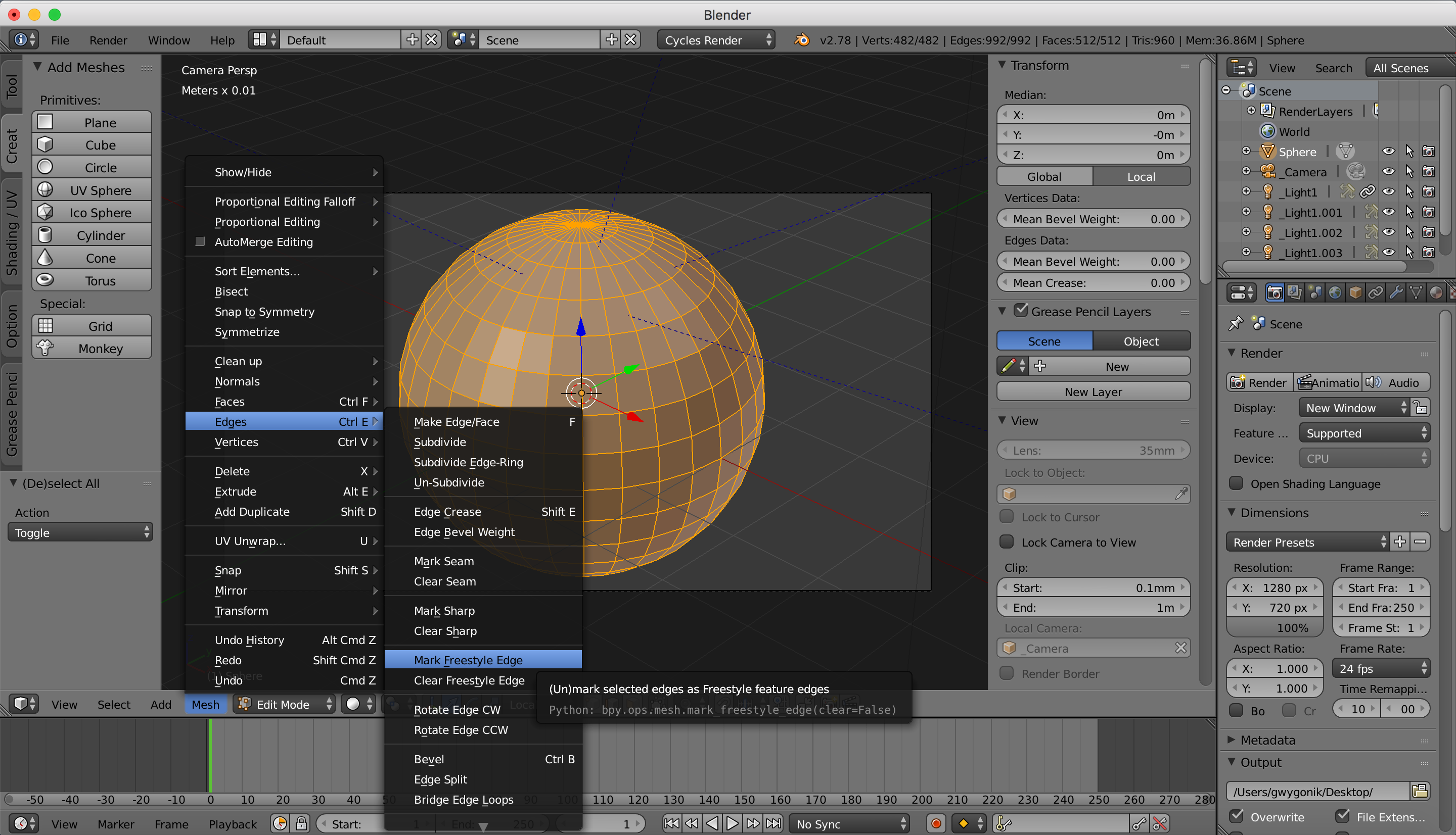 - Sometimes there are edges you don’t want to have in your render, or so many edges in a small section that they appear to be solid. While I marked every edge as a Freestyle edge, you can mark individual edges to get just the ones you want. Additionally there is the Clear Freestyle Edge option in the Mesh->Edges menu if you want to un-mark edges to make space.
