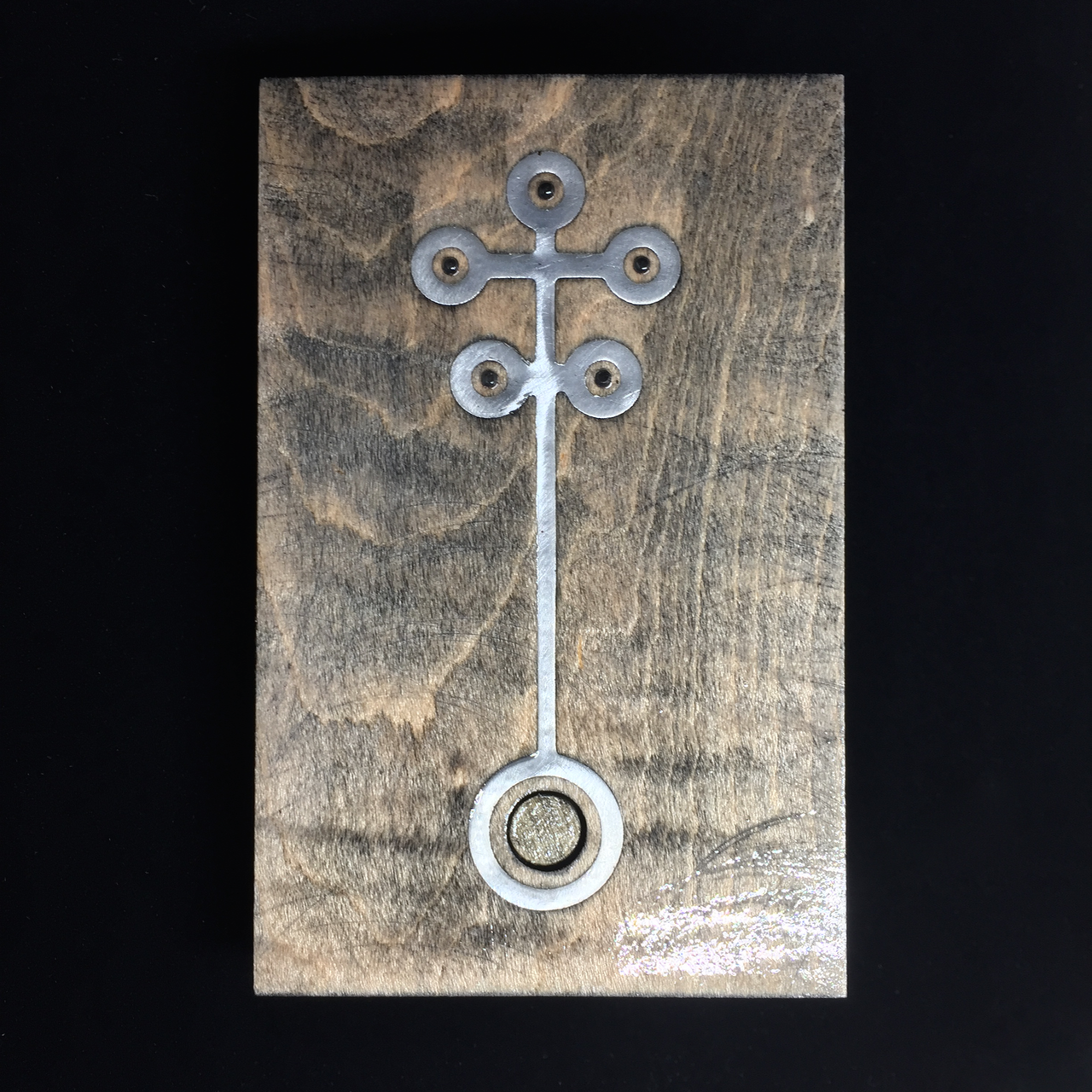 It is a piece of maple wood, a thin aluminum inlay, clear acrylic rods, and two custom circuit boards with an ATTiny85, some surface-mount LEDs, and a tiny reset switch (under a wooden button) all powered by a 2032 coin cell battery. All the wood and circuit boards were milled on my Othermill, with the circuits made in Eagle. The inlay and various SVG shapes for the cutouts were made in iDraw.