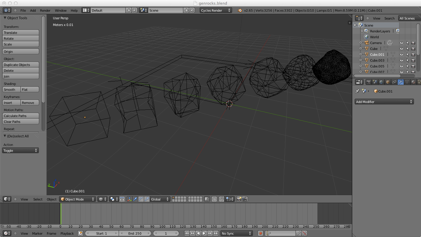 Looking at the rocks recently, I thought that it would be interesting to create my own stones using a generative approach to their design — morphing from rock shape to perfect cube shape — that I could 3D print and put with the real rocks. Having recently done a fair number of designs utilizing Blender’s various deformation tools, I knew this was not going to be a difficult project to model.